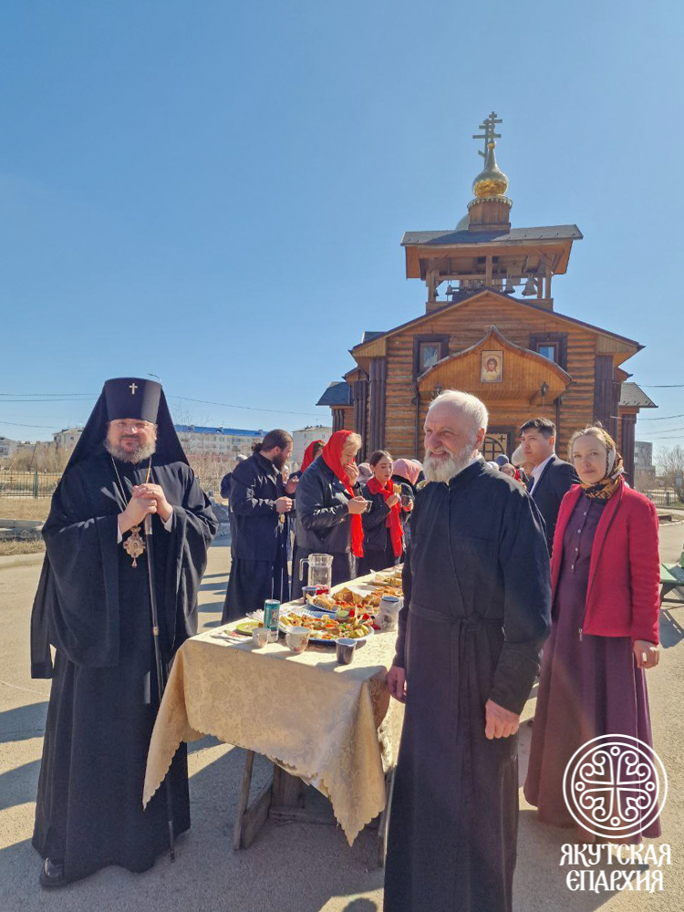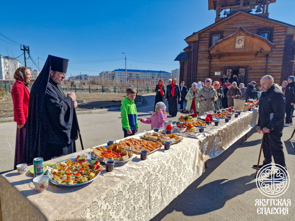 Затем, после поздравления отца настоятеля, все молящиеся были приглашены на праздничную трапезу на площади перед храмом.
