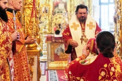 Во время Литургии согласно Указу Святейшего Патриарха Кирилла Владыка вручил настоятелю храма в честь Рождества Христова п. Айхал иерею Иоанну Серкину высокую богослужебную награду — право ношения наперсного креста с украшениями.