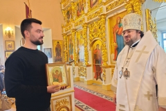 Далее Владыка тепло поздравил клирика Преображенского собора иерея Корнилия Рахманина с днём тезоименитства и вручил икону святого праведного Феодора Ушакова. Священник Корнилий несет послушание руководителя Социального отдела епархии.