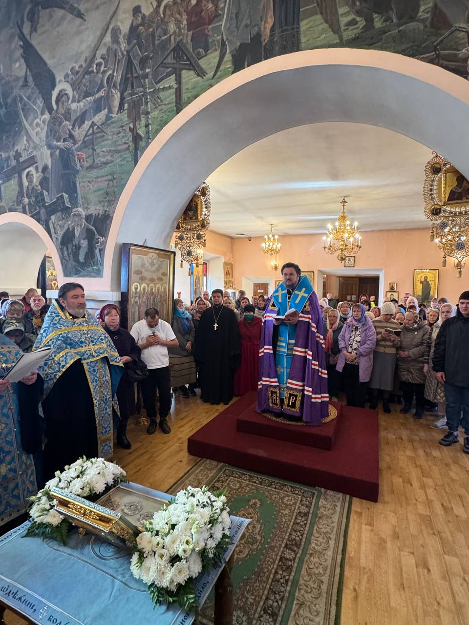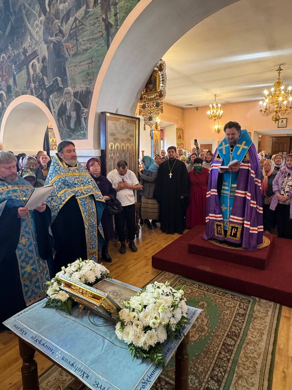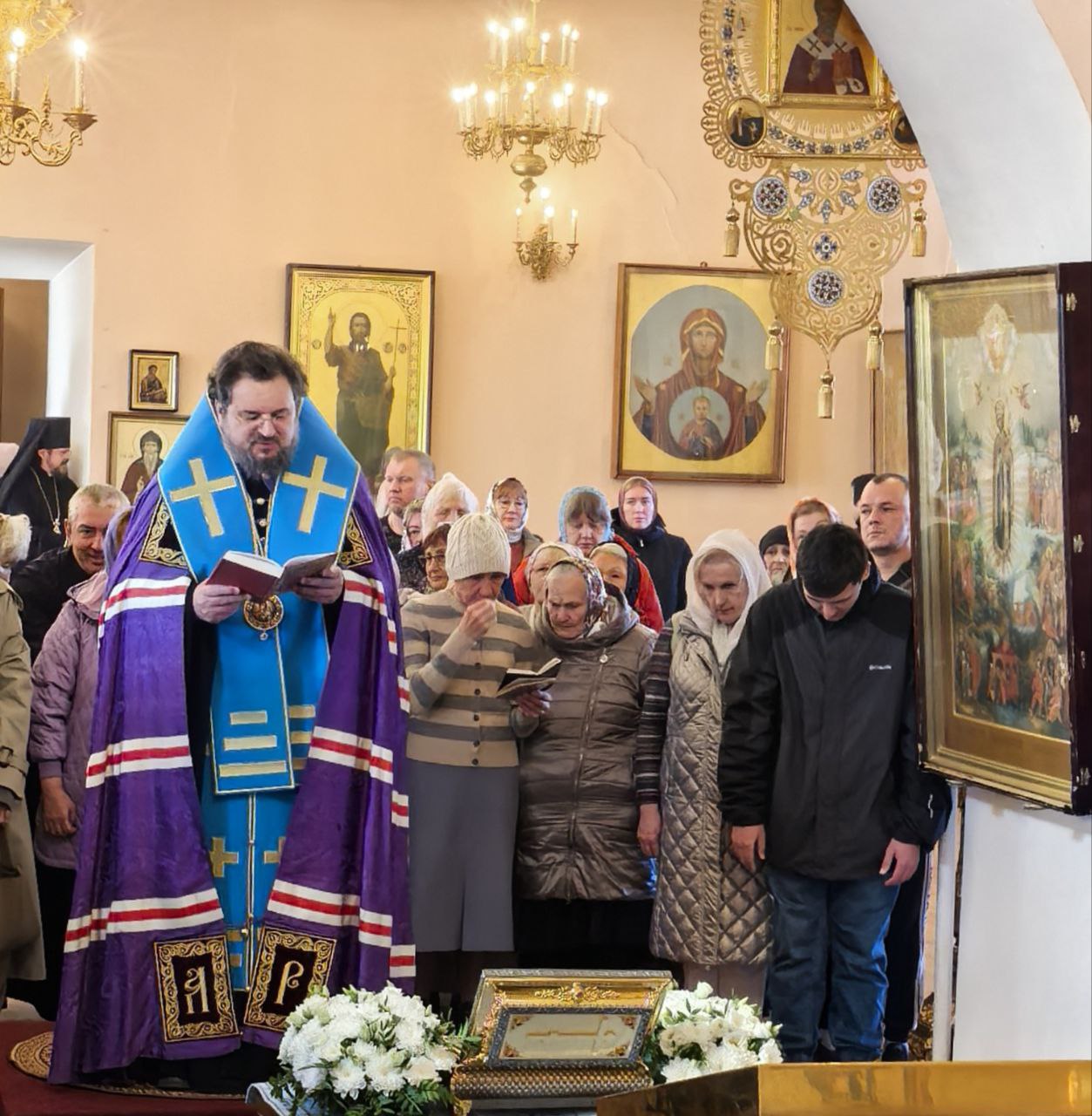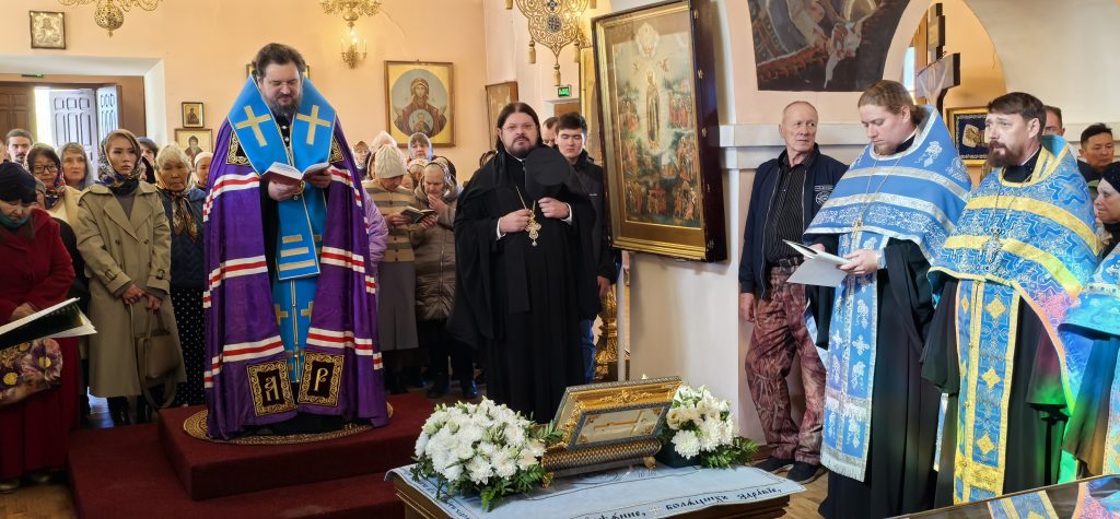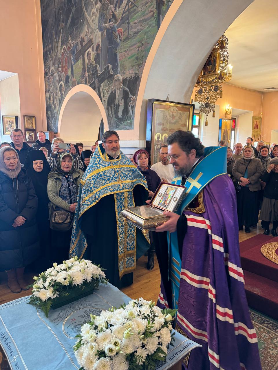 Архиепископ Роман в сослужении секретаря Якутской епархии, настоятеля собора иеромонаха Никандра (Горбатюка) и сослужащего духовенства совершил молебен с акафистым пением перед святыней, установленной в центре храма.