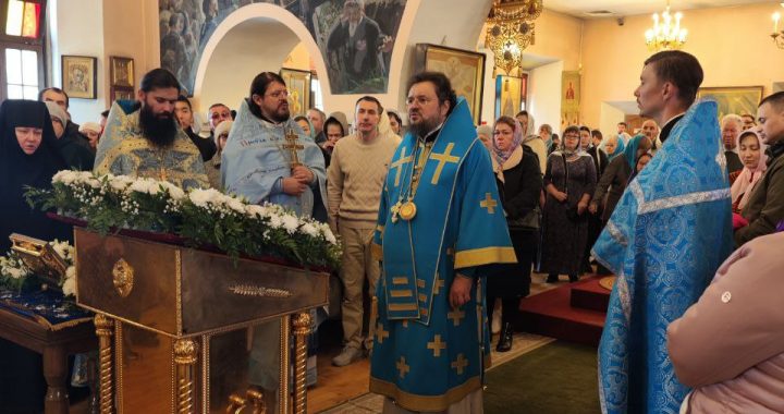 По завершении Литургии архипастырь совершил славление празднику перед ковчегом с частицей Пояса Пресвятой Богородицы, прибывшим для поклонения верующим из Казанского кафедрального собора Санкт-Петербурга.