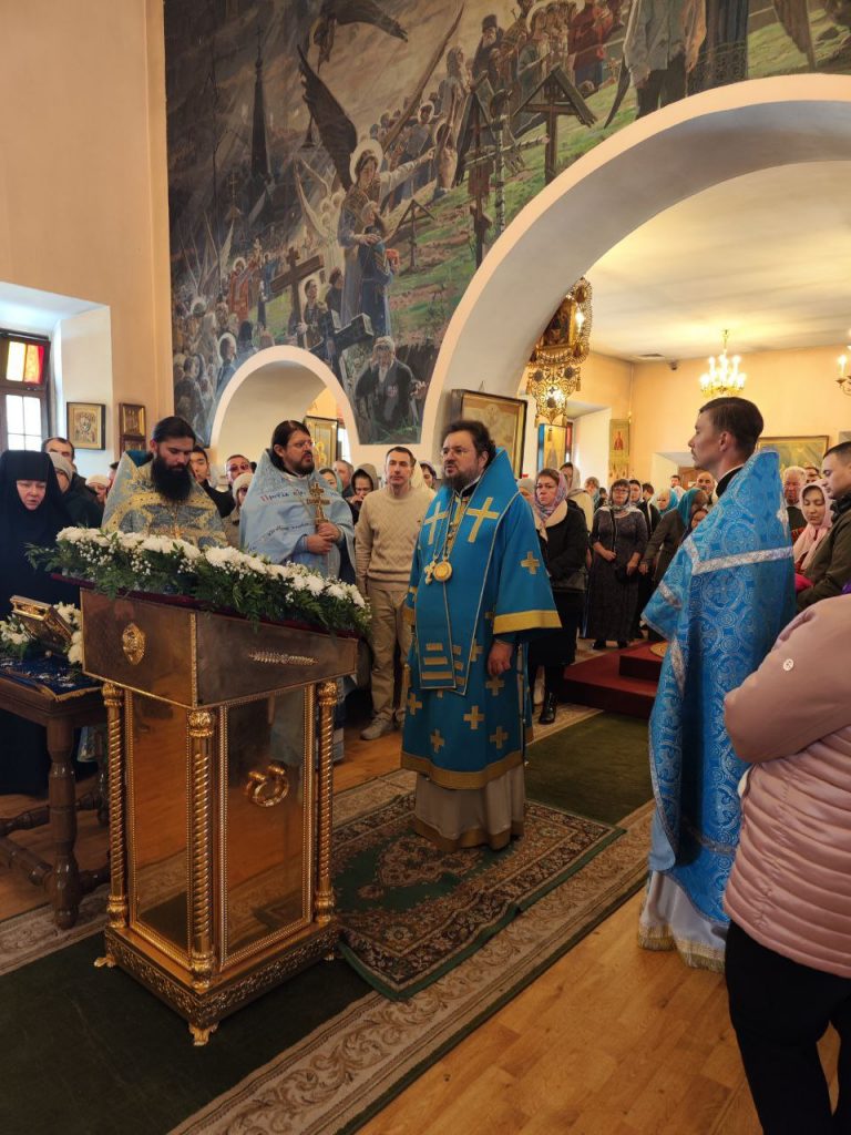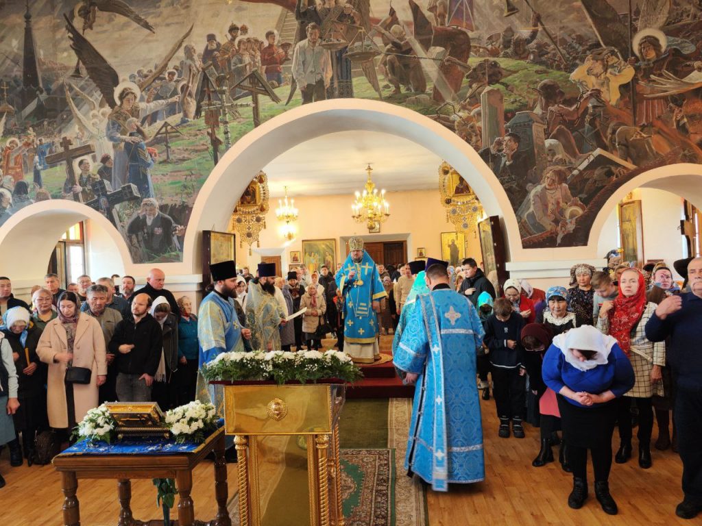 По завершении Литургии архипастырь совершил славление празднику перед ковчегом с частицей Пояса Пресвятой Богородицы, прибывшим для поклонения верующим из Казанского кафедрального собора Санкт-Петербурга.