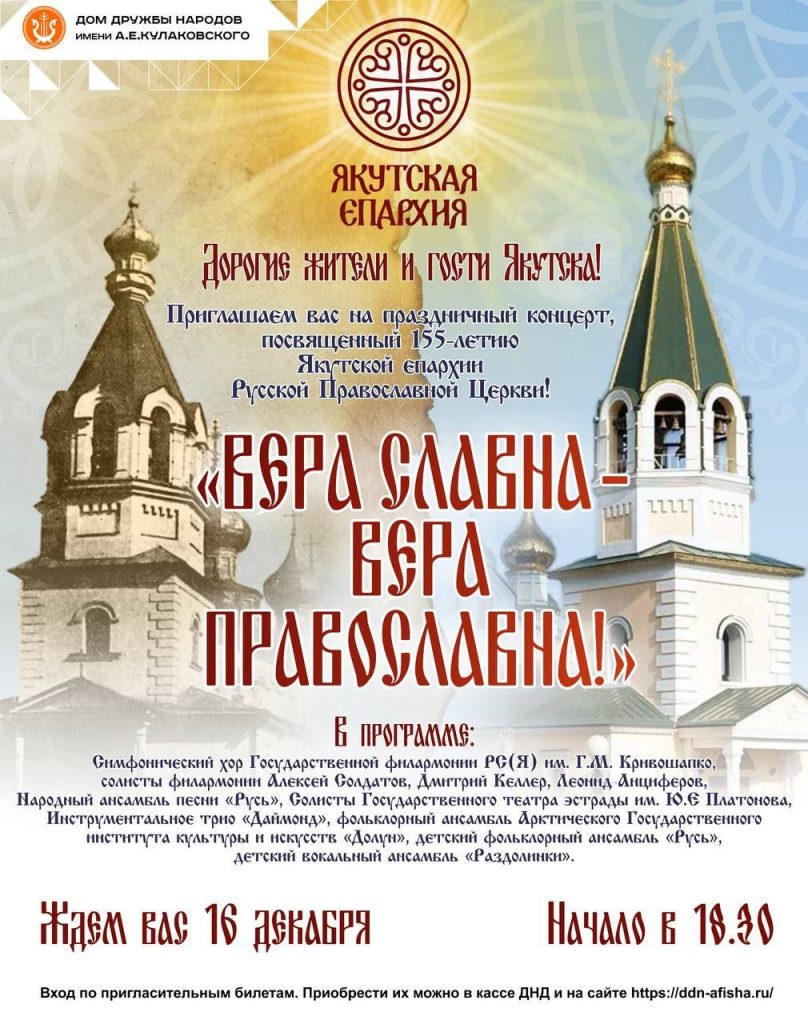 16 декабря 2025 года в Доме дружбы народов имени А.Е. Кулаковского состоится праздничный концерт, посвященный 155-летию основания Якутской епархии.