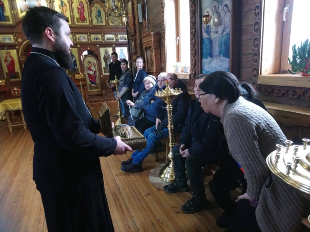 Священник рассказал гостям об истории строительства, о чудесном сохранении стройматериалов во время большого наводнения. Также священник рассказал об устройстве храма и показал значимые святыни.
