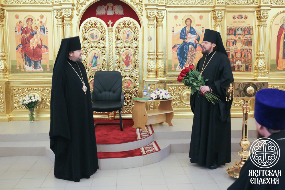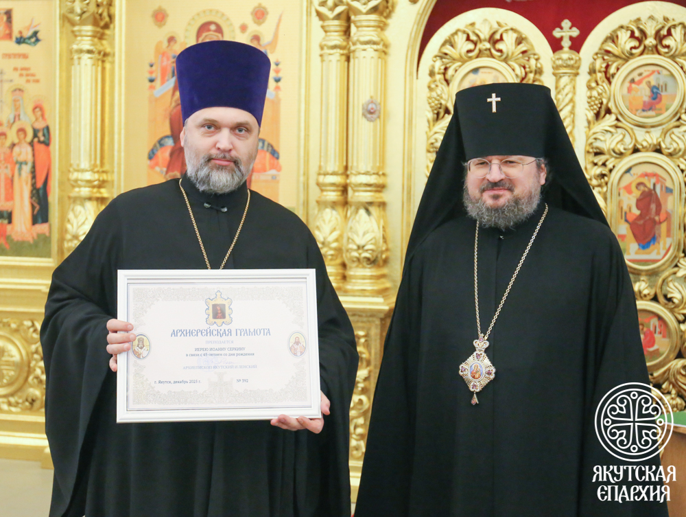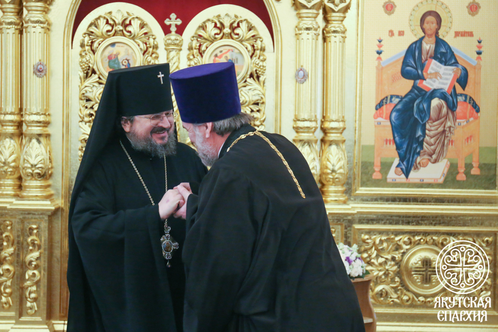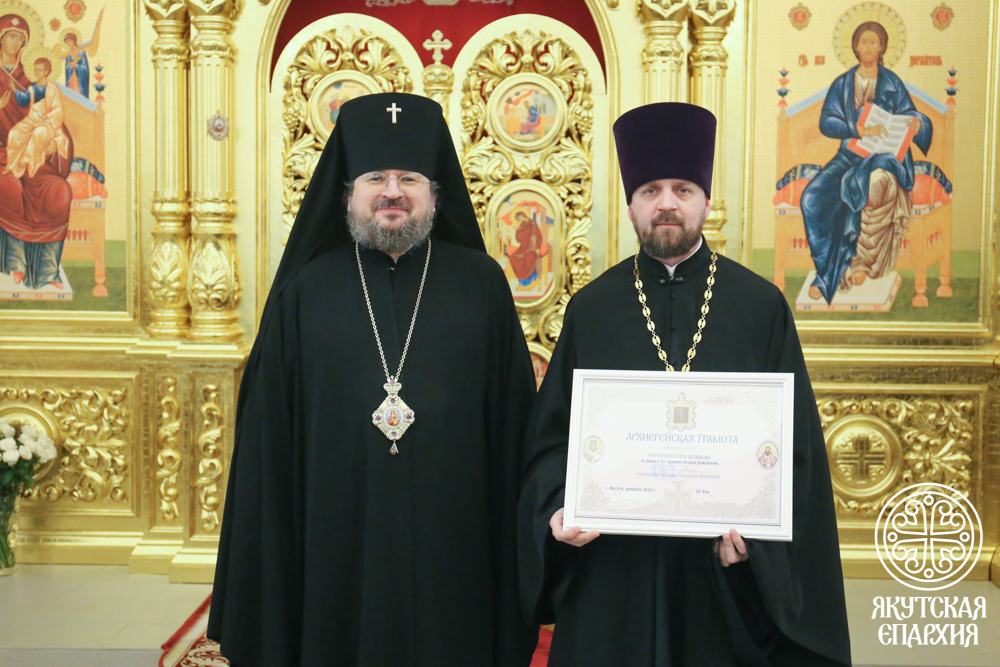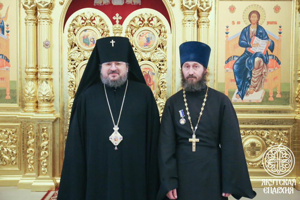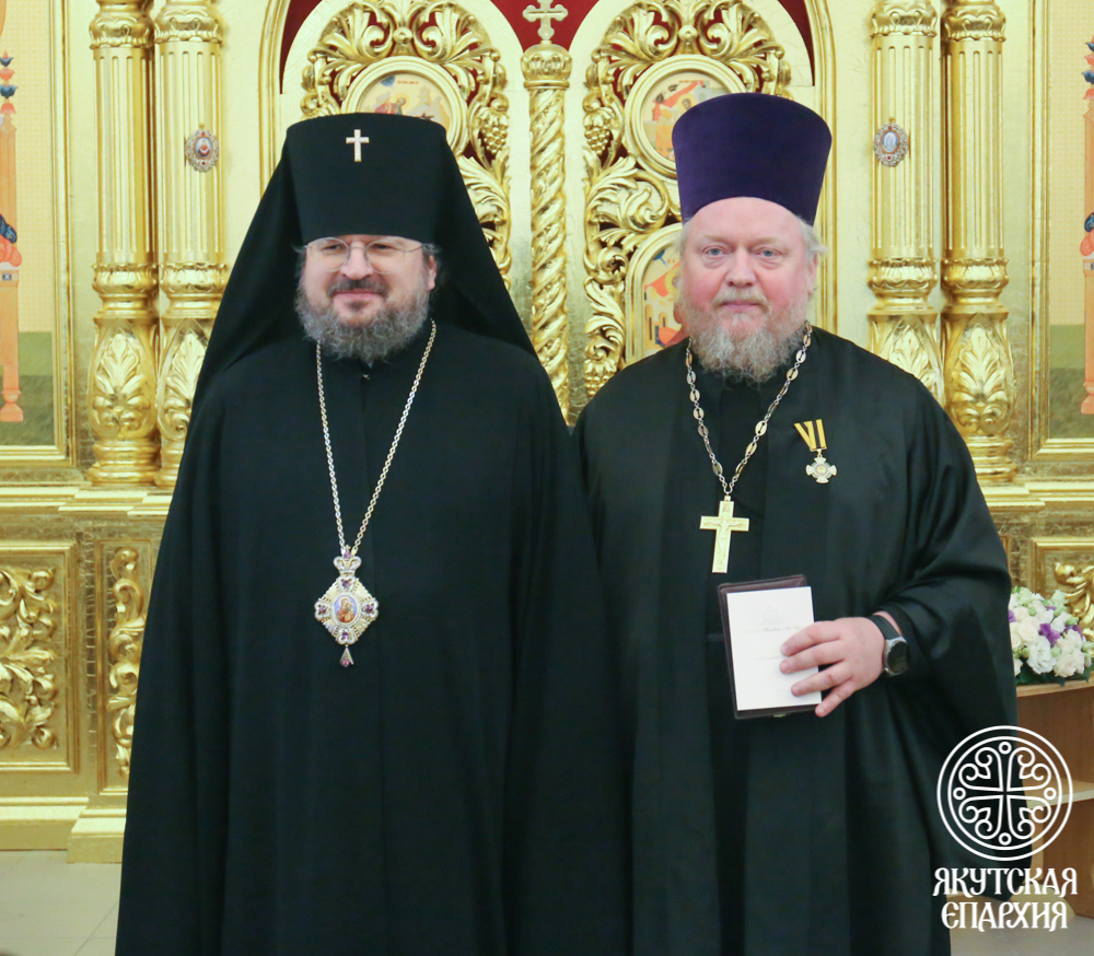 Медалями Якутской епархии священномученика Евгения (Зернова) были награждены настоятель храма святого праведного Иоанна Кронштадтского пос. Беркакит Нерюнгринского благочиния иерей Владимир Тарасов по случаю юбилея и настоятель храма пророка Божия Илии гор. Томмот Алданского благочиния иерей Вячеслав Канинин за проявленное мужество при спасении человека. Благословенных архиерейских грамот к личным юбилеям удостоены руководитель епархиального отдела по культуре иерей Виталий Беликов и настоятель храма Рождества Христова пос. Айхал Мирнинского благочиния иерей Иоанн Серкин.