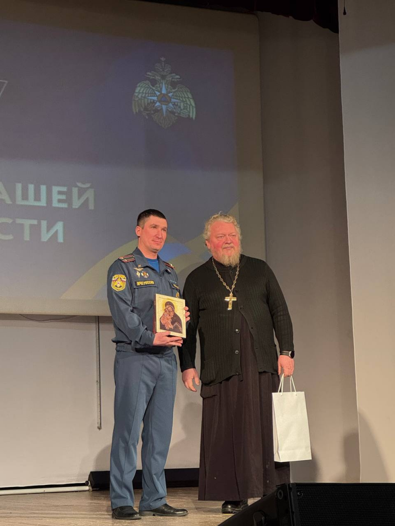 Священник выступил с приветственным словом, поблагодарив сотрудников за мужество и отвагу, при этом отметив, что готовность к самопожертвованию является высочайшей добродетелью. В завершении слова подразделению были вручены подарки.