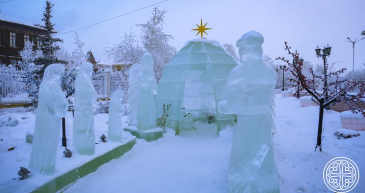 Затем владыка освятил ледяной рождественский вертеп на площади перед собором.