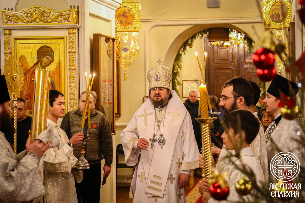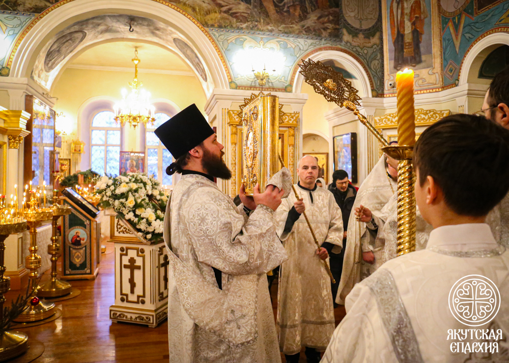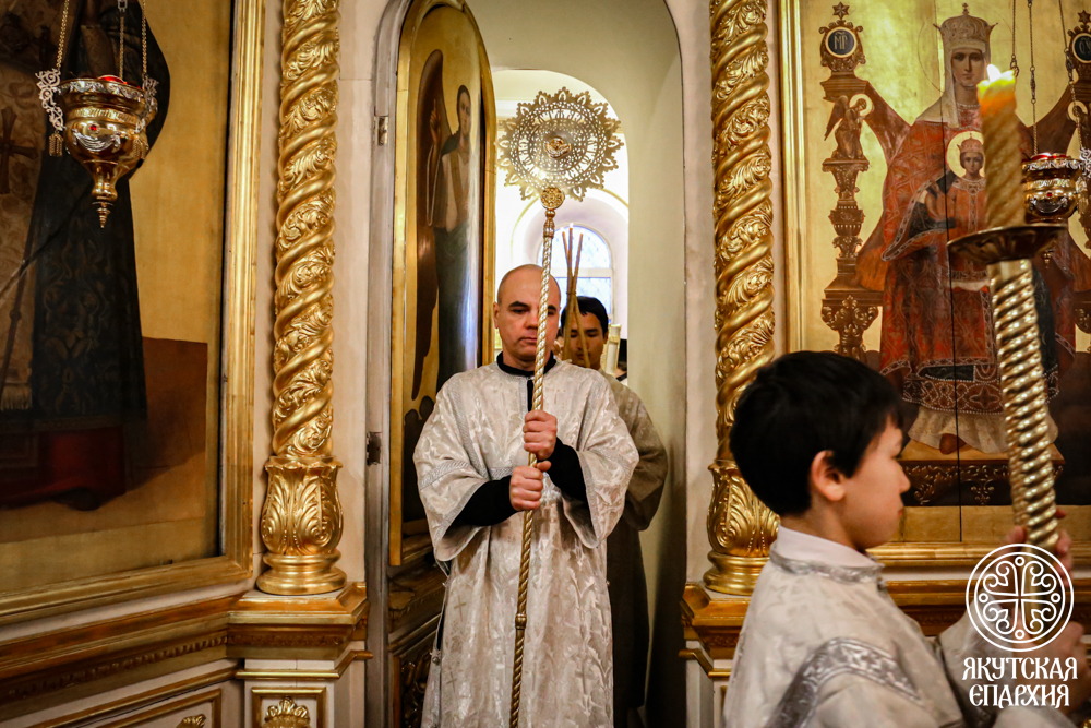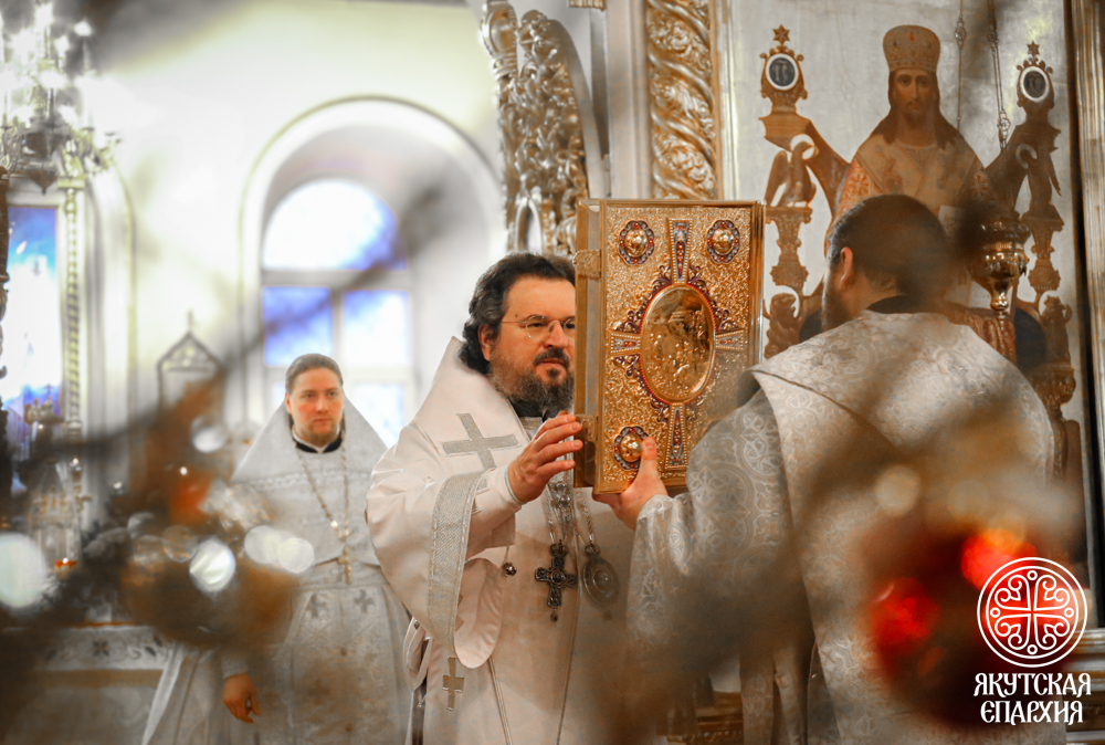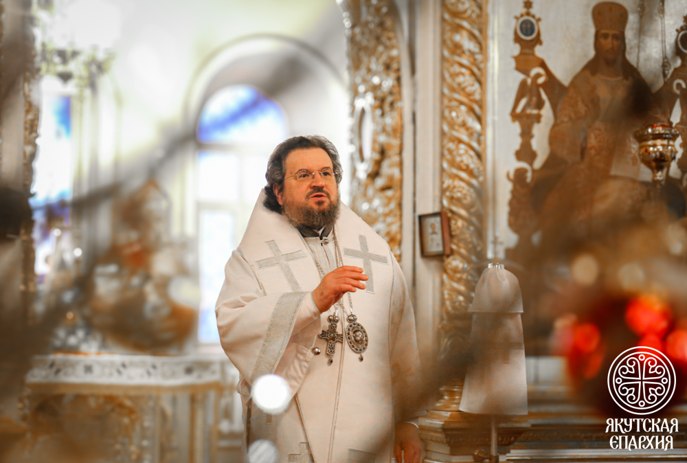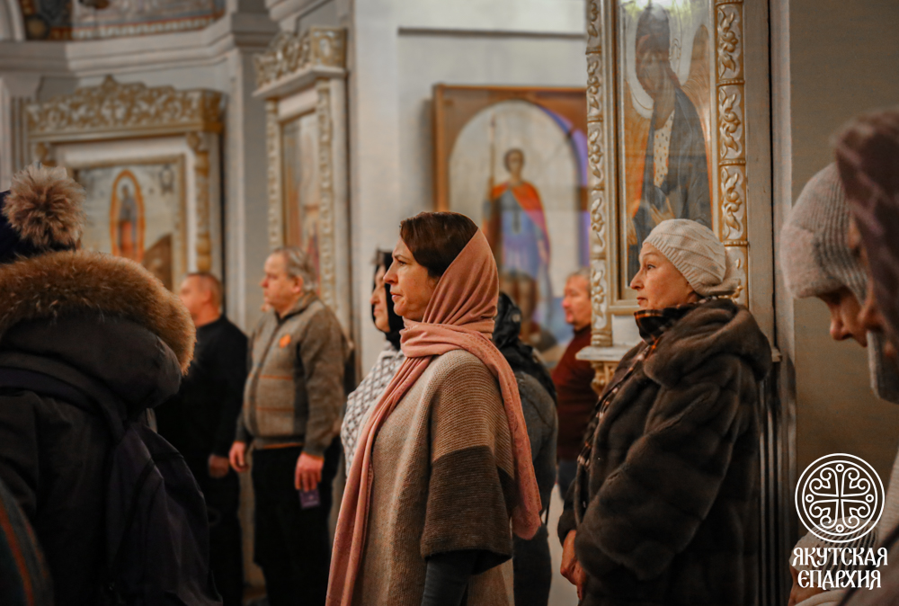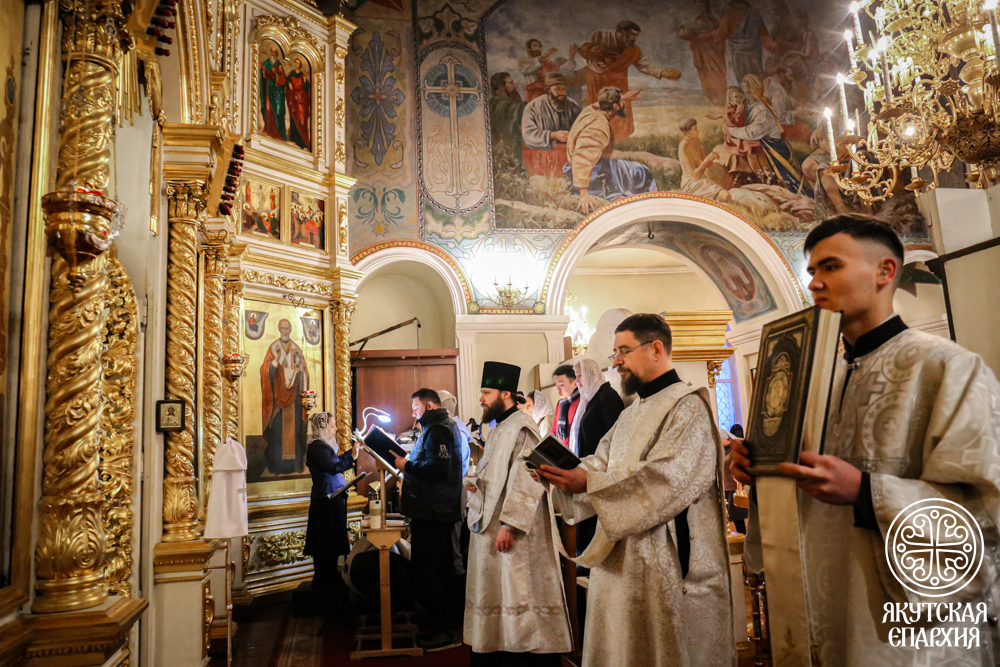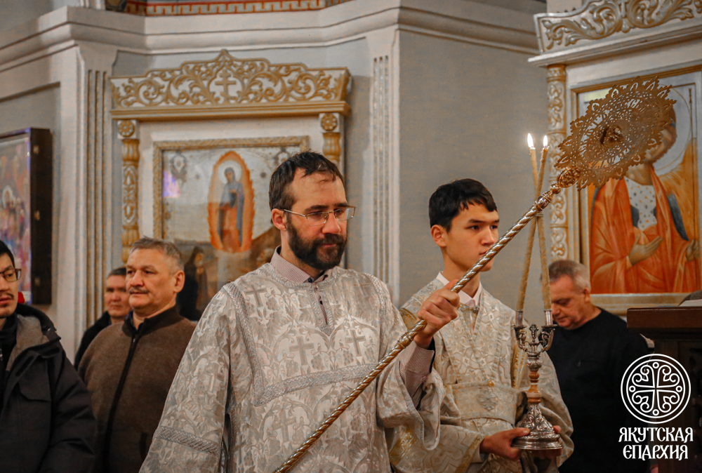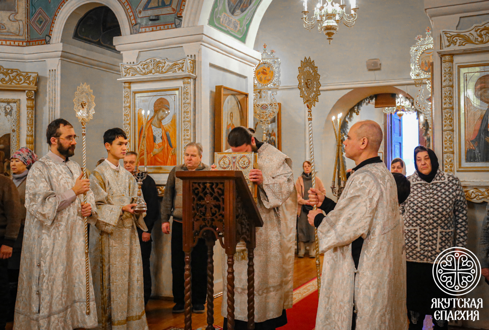 Особо владыка приветствовал настоятеля иерея Александра Коробкина и поблагодарил за усердное служение. Со словами признательности он обратился к Людмиле Анатольевне Шумиловой — хормейстеру Симфонического хора Филармонии Якутии, который регулярно исполняет богослужебные песнопения за архиерейскими богослужениями в Якутске.