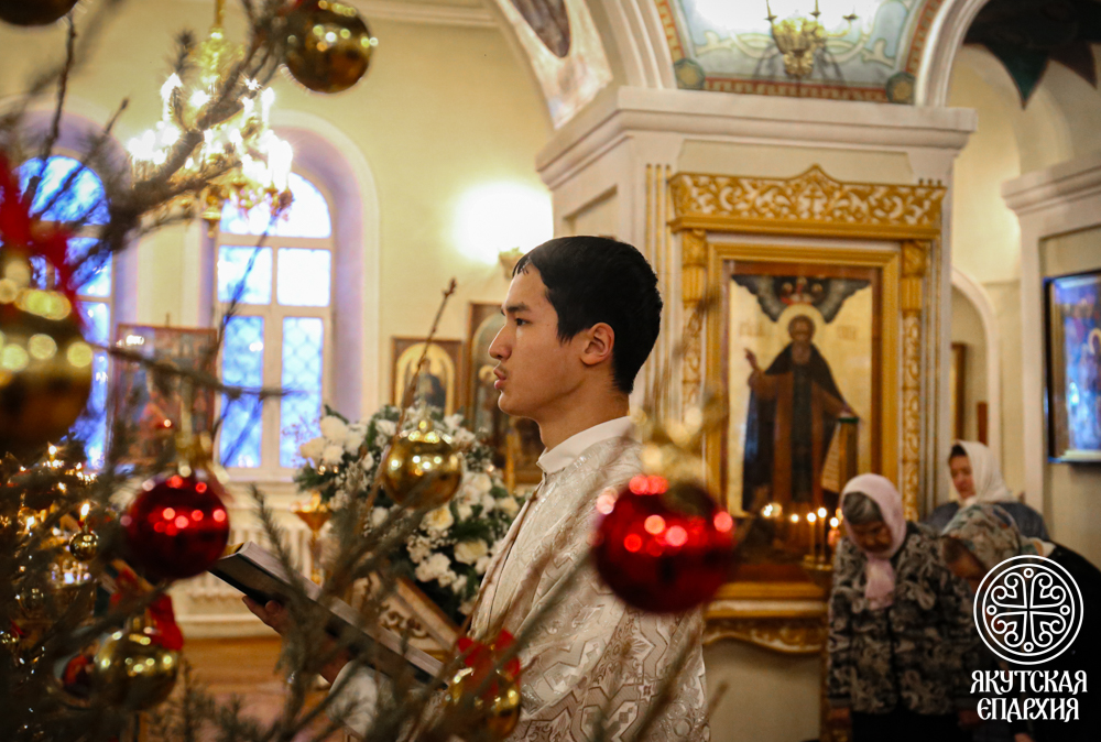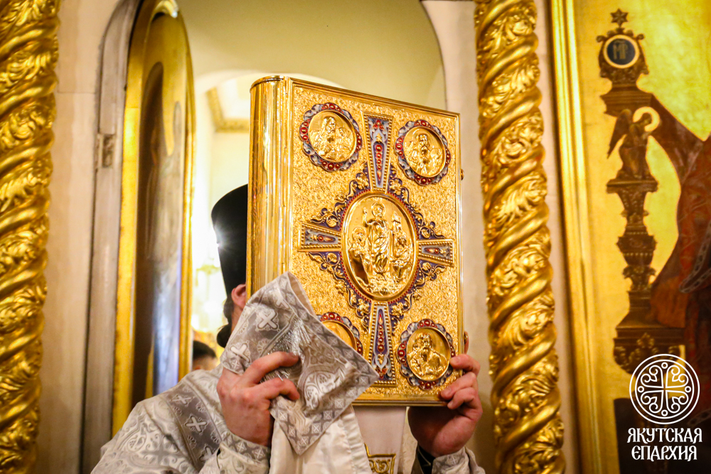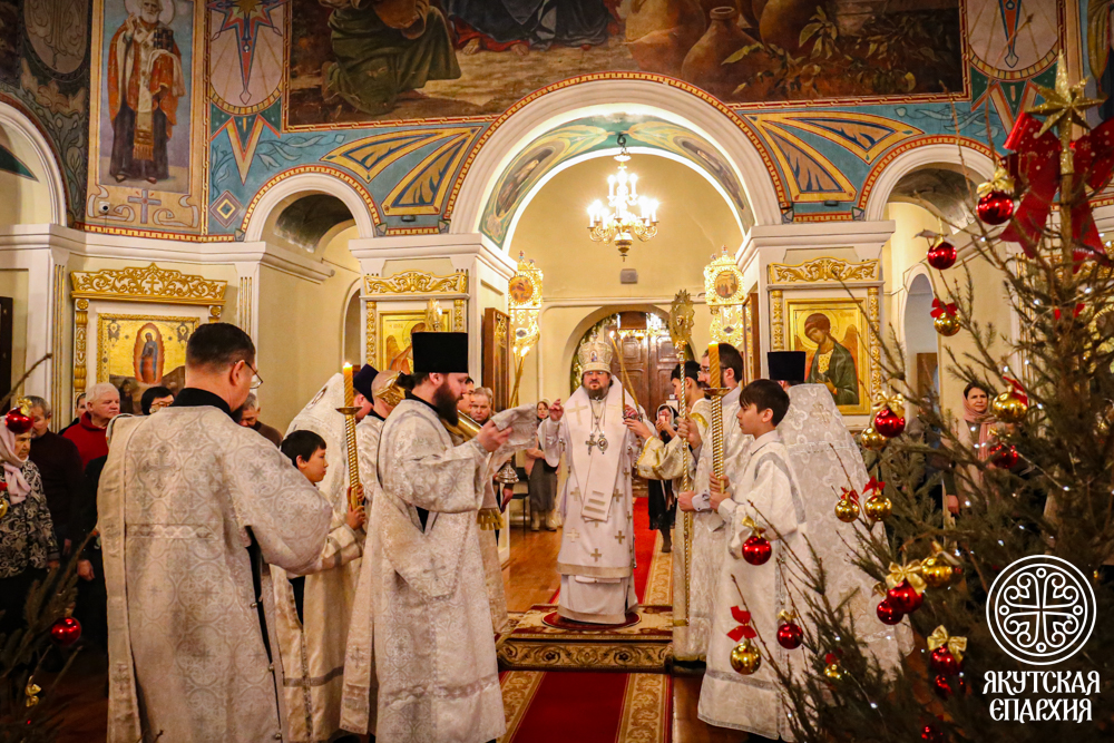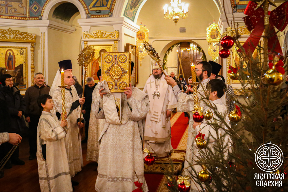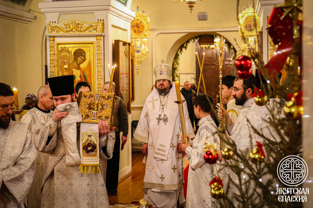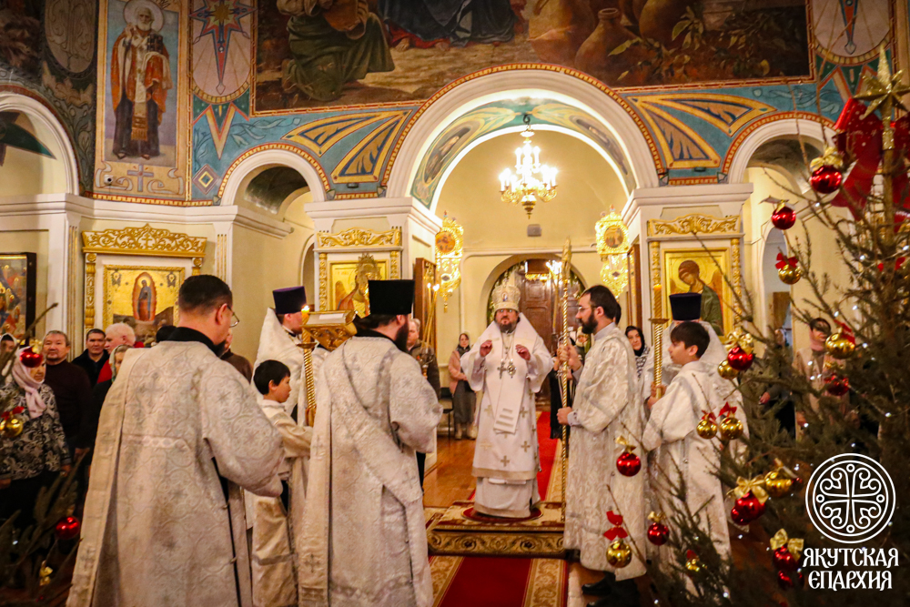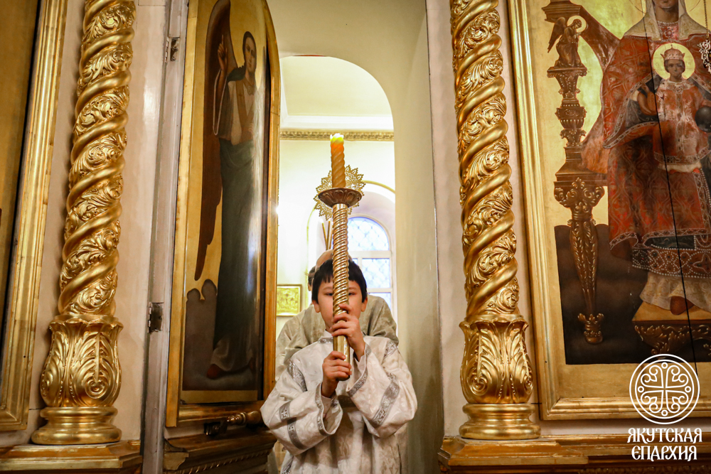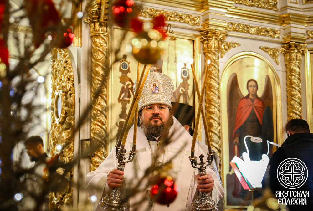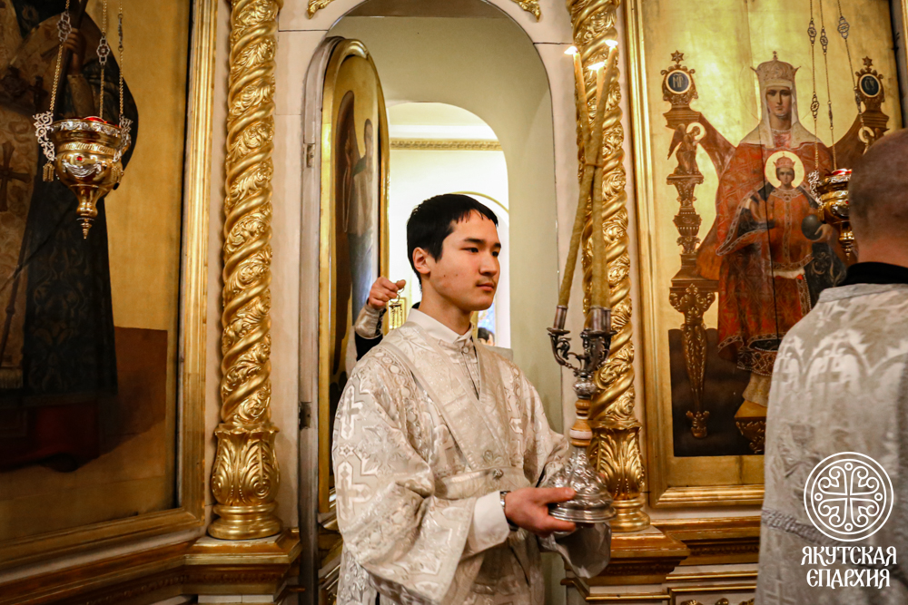 Особо владыка приветствовал настоятеля иерея Александра Коробкина и поблагодарил за усердное служение. Со словами признательности он обратился к Людмиле Анатольевне Шумиловой — хормейстеру Симфонического хора Филармонии Якутии, который регулярно исполняет богослужебные песнопения за архиерейскими богослужениями в Якутске.