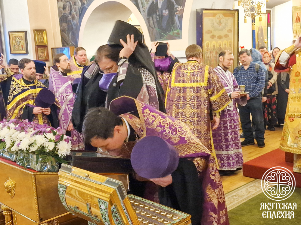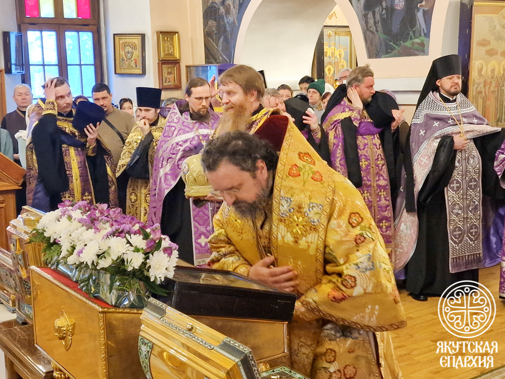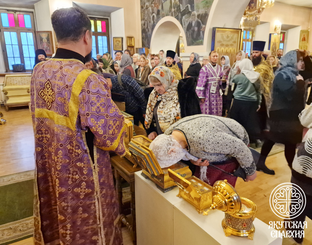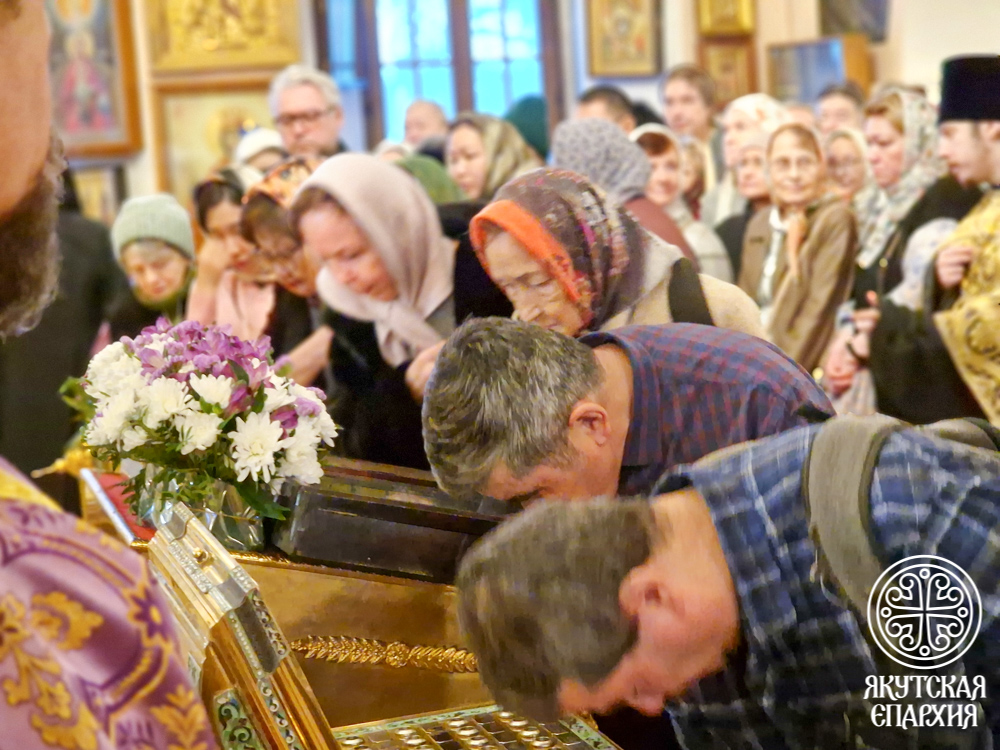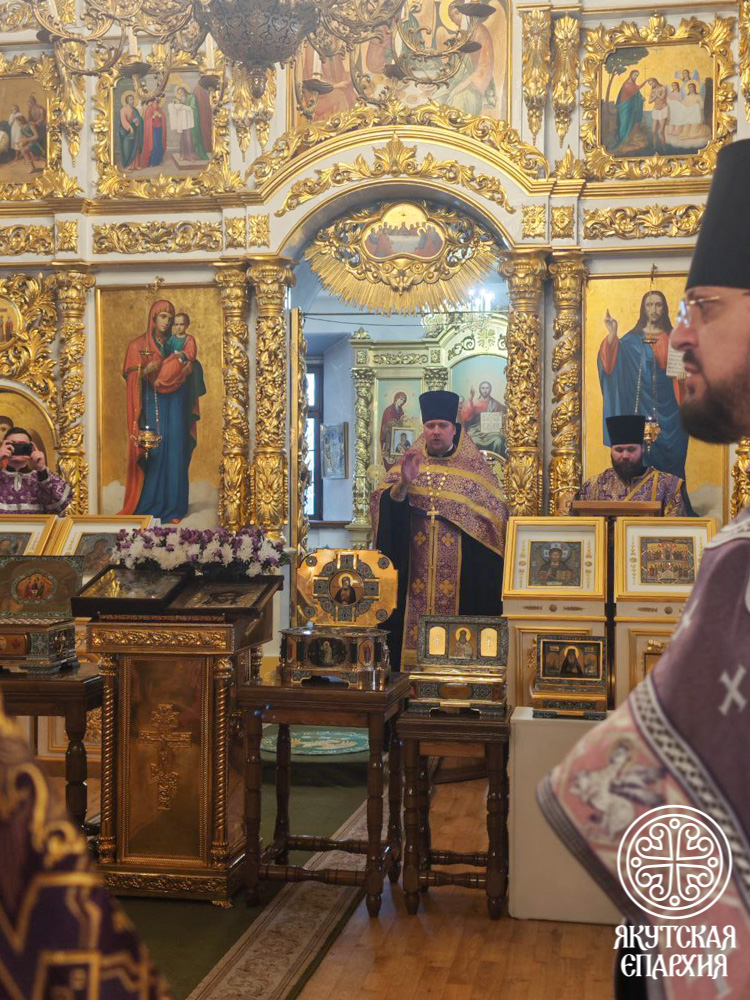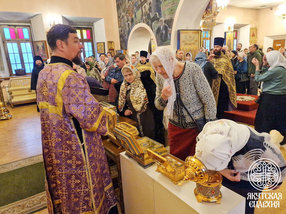 На середину храма были изнесены для поклонения верующим святыни города Якутска: частица Животворящего Креста Господня, чтимые иконы Спасителя и Божией Матери, мощи святителей Николая Чудотворца, Иннокентия Московского, Мелетия Рязанского, преподобного Серафима Саровского и других подвижников благочестия.
