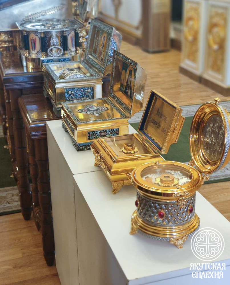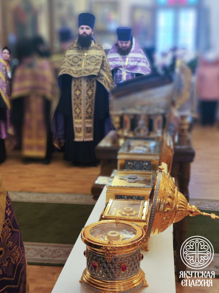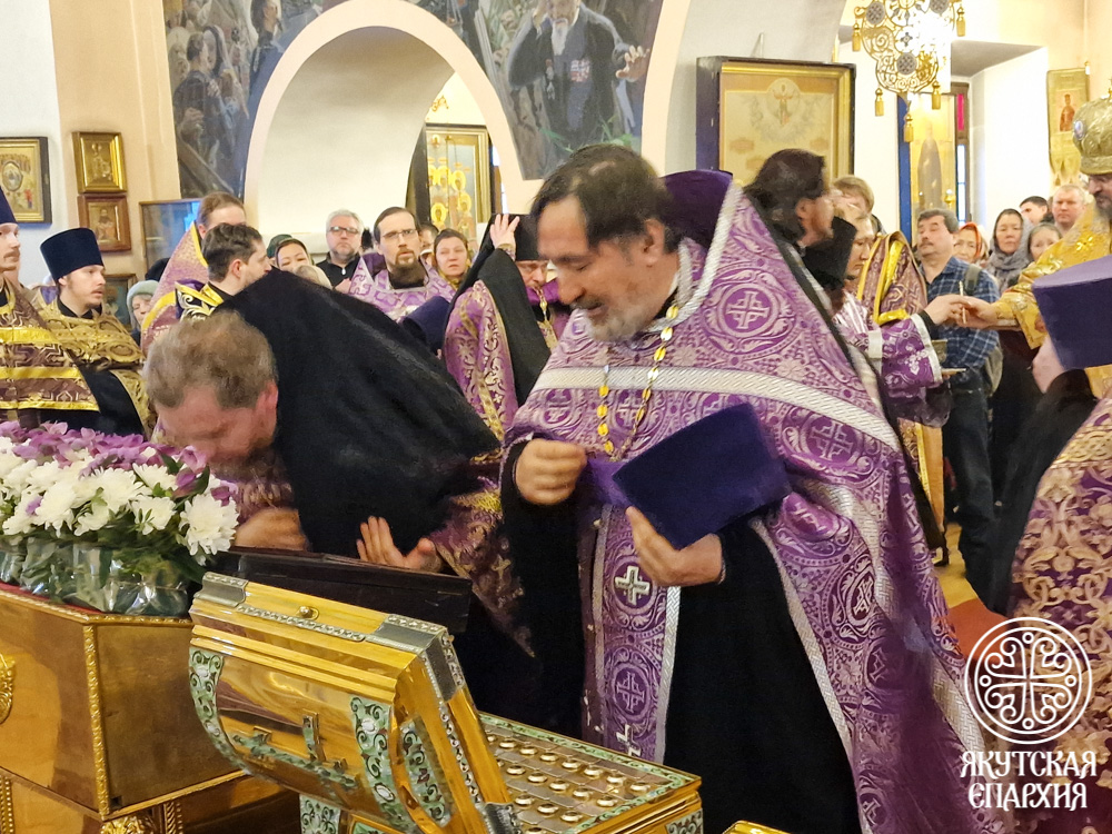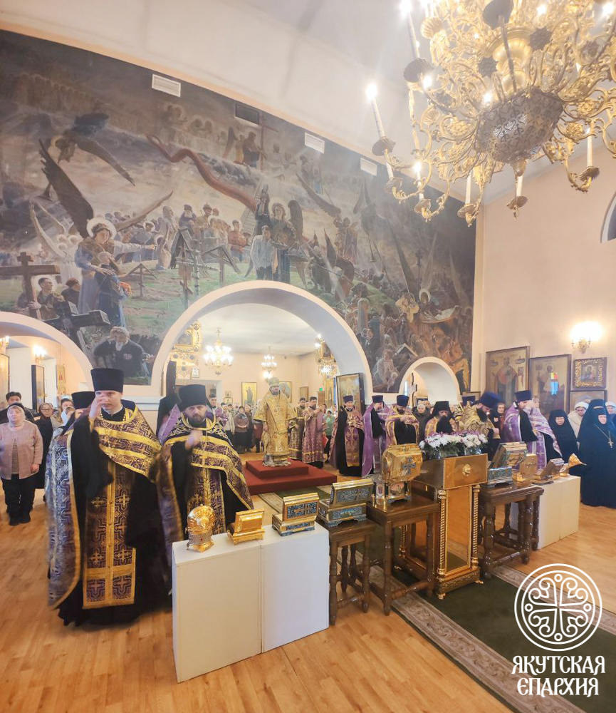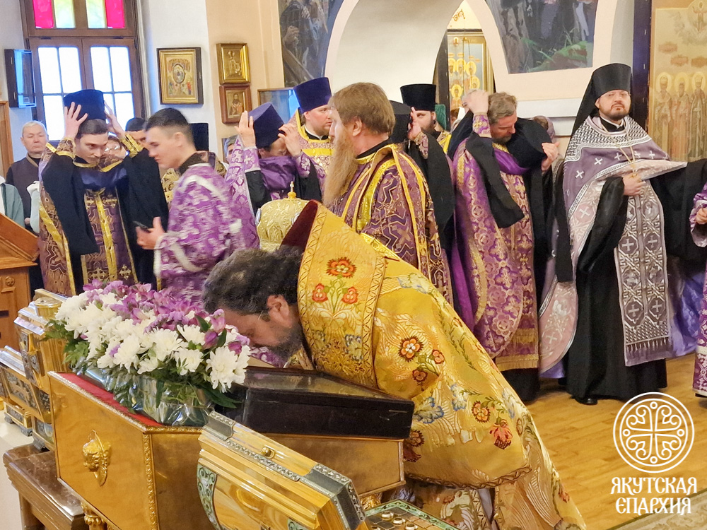 На середину храма были изнесены для поклонения верующим святыни города Якутска: частица Животворящего Креста Господня, чтимые иконы Спасителя и Божией Матери, мощи святителей Николая Чудотворца, Иннокентия Московского, Мелетия Рязанского, преподобного Серафима Саровского и других подвижников благочестия.